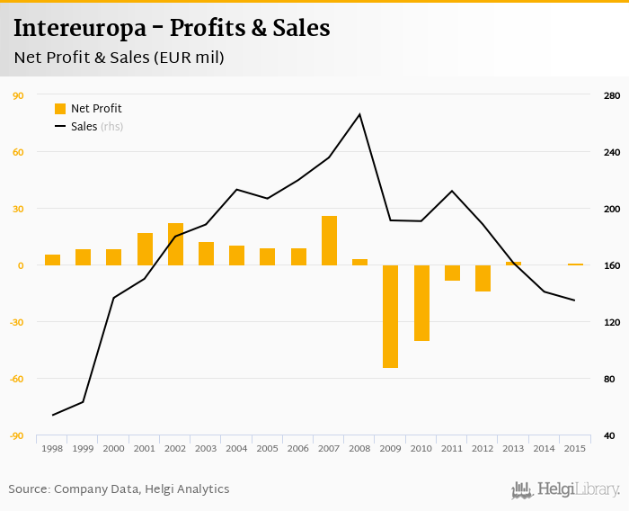 Intereuropa made a net profit of EUR 1.05 mil in 2015, up 636% compared to the previous year. Total sales reached EUR 135 mil, which is down 4.37% when compared to the previous year.