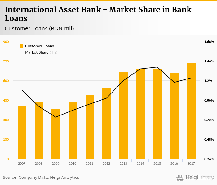 International Asset Bank accounted for 1.23% of all customer loans issued in Bulgaria at the end of 2017. Historically, the bank’s market share in customer loans reached an all time high of 1.36% in 2015 and an all time low of 0.749% in 2009.