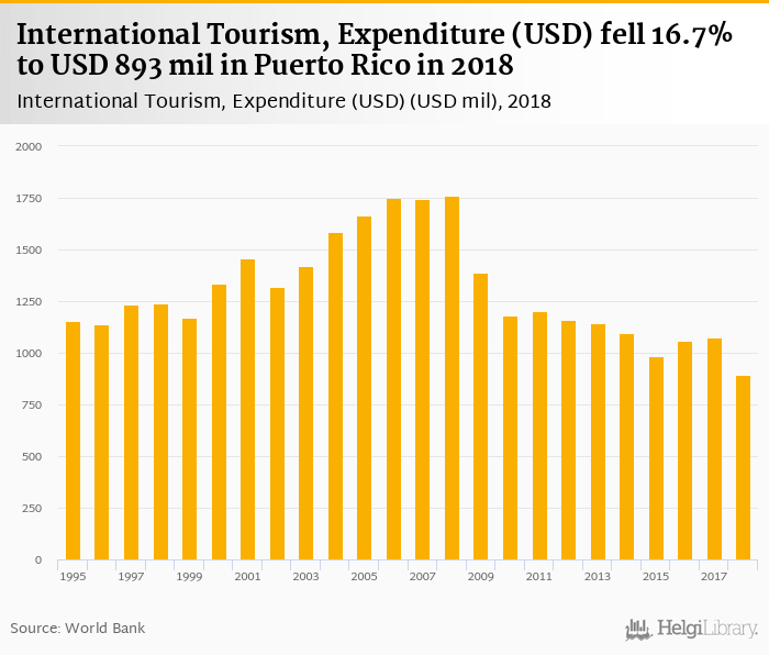 Expenditure of international tourism fell 16.7% to USD 893 mil in Puerto Rico in 2018, according to Eurostat.