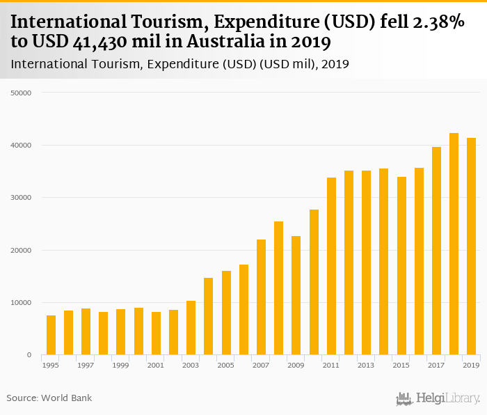 Expenditure of international tourism fell 2.38% to USD 41,430 mil in Australia in 2019, according to Eurostat.