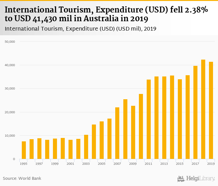 Expenditure of international tourism fell 2.38% to USD 41,430 mil in Australia in 2019, according to Eurostat.