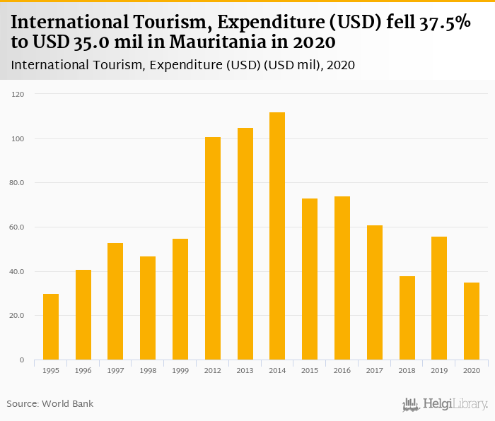 Expenditure of international tourism fell 37.5% to USD 35.0 mil in Mauritania in 2020, according to Eurostat.