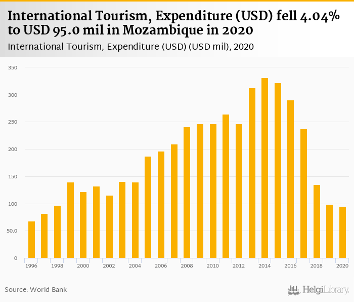 Expenditure of international tourism fell 4.04% to USD 95.0 mil in Mozambique in 2020, according to Eurostat.