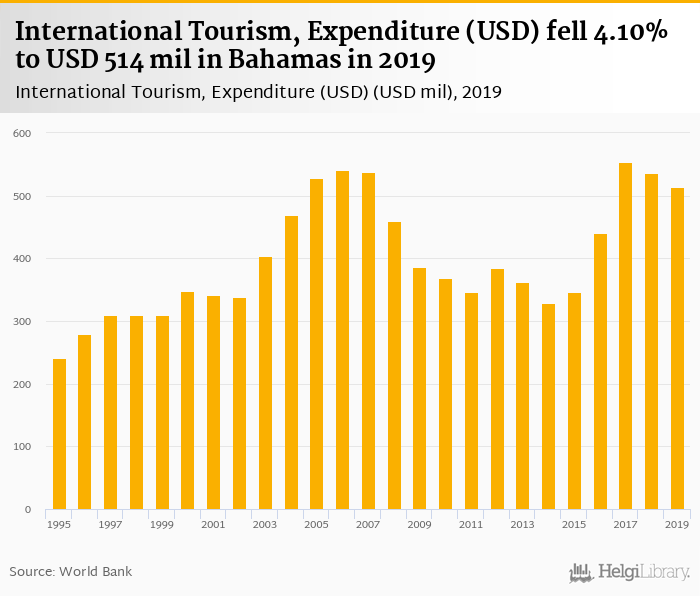 Expenditure of international tourism fell 4.10% to USD 514 mil in Bahamas in 2019, according to Eurostat.