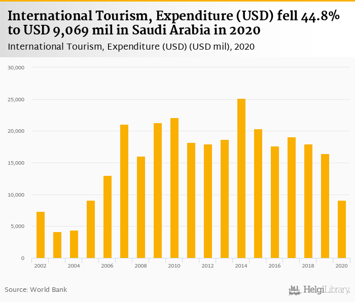 Expenditure of international tourism fell 44.8% to USD 9,069 mil in Saudi Arabia in 2020, according to Eurostat.
