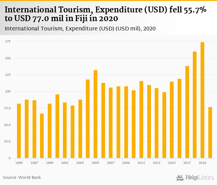 Expenditure of international tourism fell 55.7% to USD 77.0 mil in Fiji in 2020, according to Eurostat.
