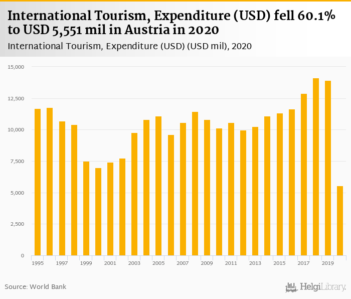 Historically, expenditure of international tourism in Austria reached an all time high of USD 14,109 mil in 2018 and an all time low of USD 5,551 mil in 2020.