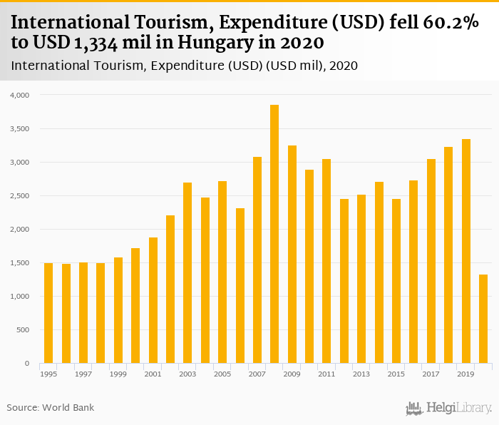 Historically, expenditure of international tourism in Hungary reached an all time high of USD 3,857 mil in 2008 and an all time low of USD 1,334 mil in 2020. When compared to Hungary's main peers, expenditure of international tourism in Austria amounted to USD 5,551 mil, USD 3,495 mil in Czechia, USD 5,547 mil in Poland and USD 1,291 mil in Slovakia in 2020.