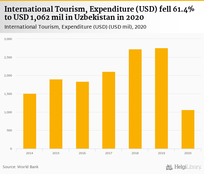 Expenditure of international tourism fell 61.4% to USD 1,062 mil in Uzbekistan in 2020, according to Eurostat.