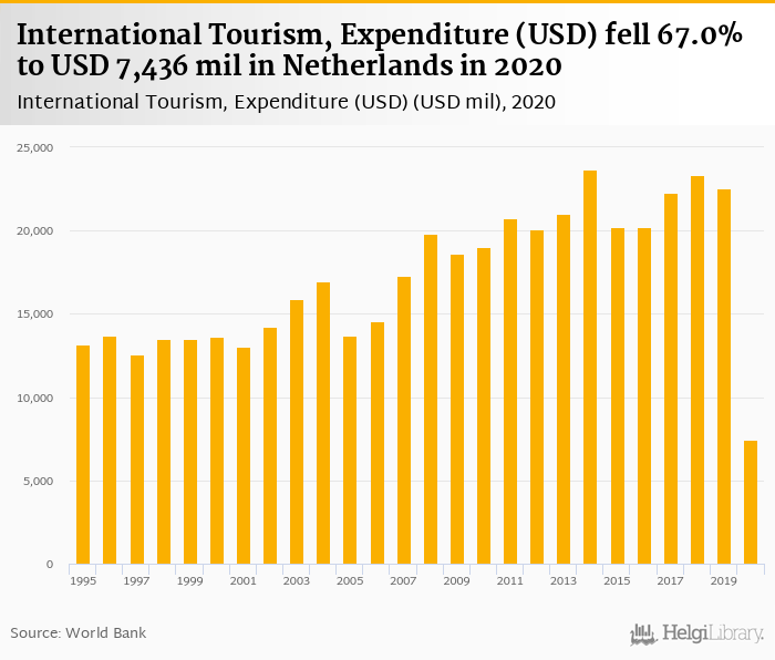 Historically, expenditure of international tourism in Netherlands reached an all time high of USD 23,655 mil in 2014 and an all time low of USD 7,436 mil in 2020.