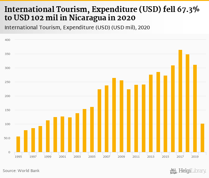 Expenditure of international tourism fell 67.3% to USD 102 mil in Nicaragua in 2020, according to Eurostat.
