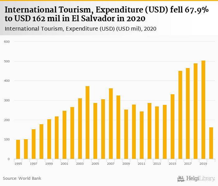 Expenditure of international tourism fell 67.9% to USD 162 mil in El Salvador in 2020, according to Eurostat.