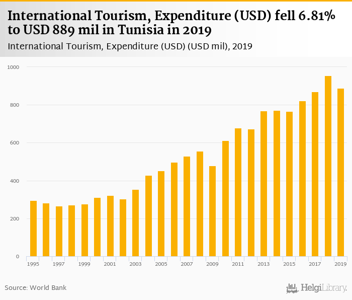 Expenditure of international tourism fell 6.81% to USD 889 mil in Tunisia in 2019, according to Eurostat.