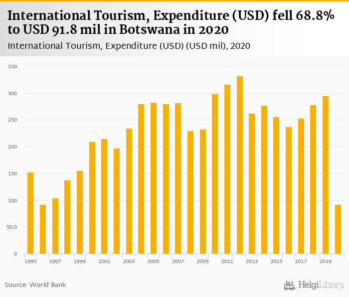 Expenditure of international tourism fell 68.8% to USD 91.8 mil in Botswana in 2020, according to Eurostat.