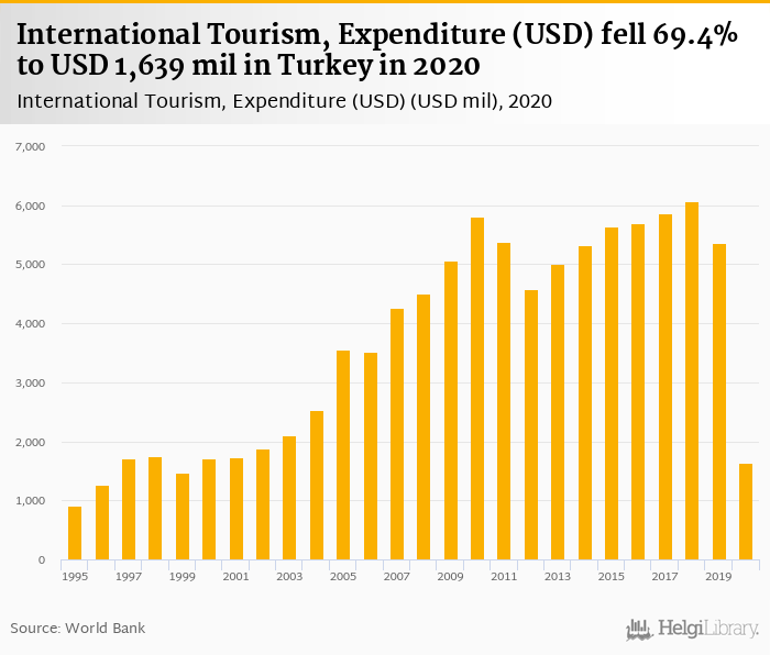 Expenditure of international tourism fell 69.4% to USD 1,639 mil in Turkey in 2020, according to Eurostat.