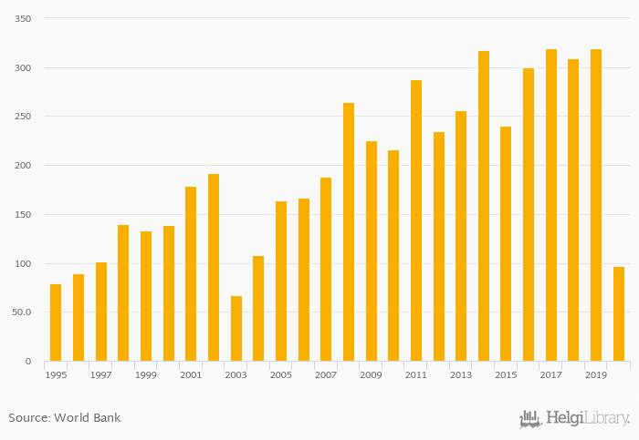 Historically, expenditure of international tourism in Madagascar reached an all time high of USD 319 mil in 2019 and an all time low of USD 67.0 mil in 2003.