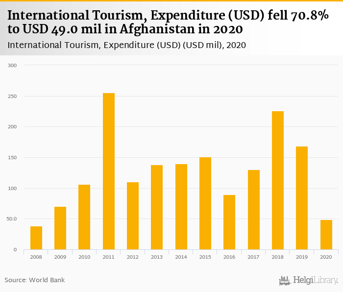 Expenditure of international tourism fell 70.8% to USD 49.0 mil in Afghanistan in 2020, according to Eurostat.