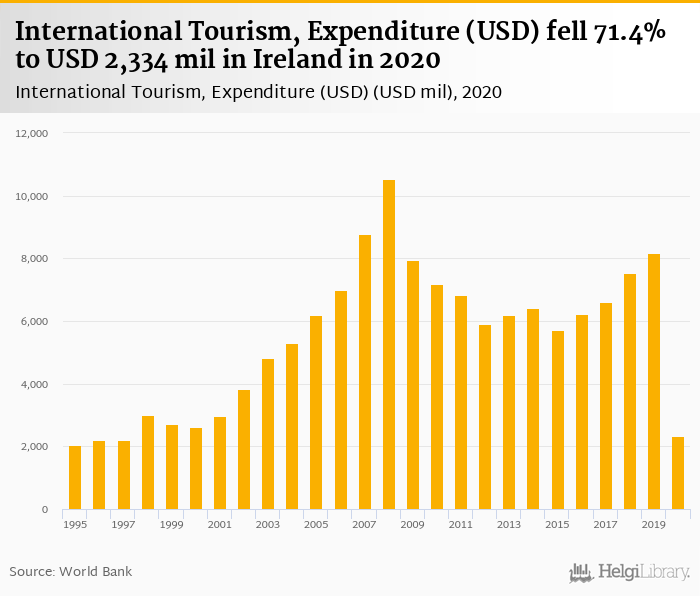 Expenditure of international tourism fell 71.4% to USD 2,334 mil in Ireland in 2020, according to Eurostat.