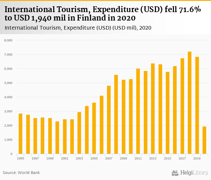 Expenditure of international tourism fell 71.6% to USD 1,940 mil in Finland in 2020, according to Eurostat.