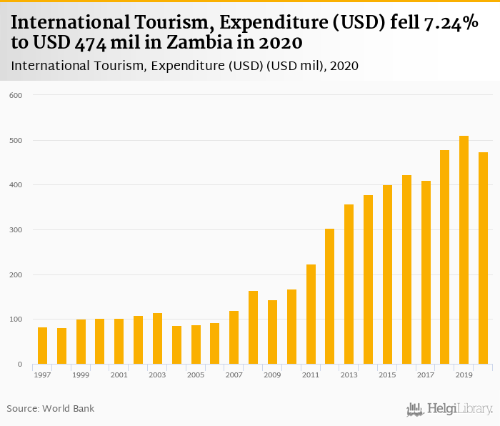 Expenditure of international tourism fell 7.24% to USD 474 mil in Zambia in 2020, according to Eurostat.
