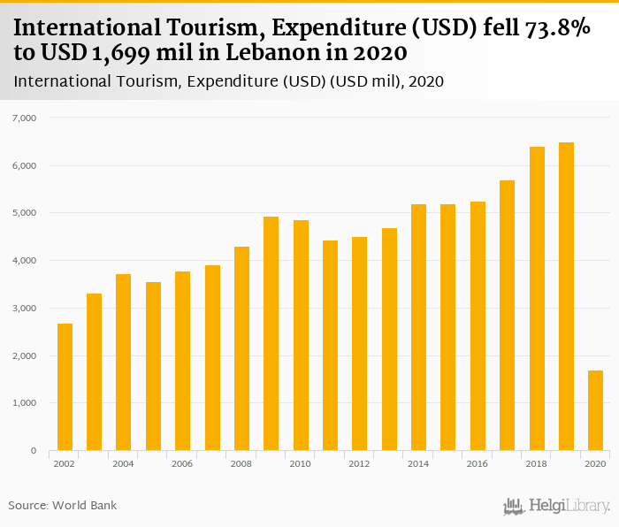 Historically, expenditure of international tourism in Lebanon reached an all time high of USD 6,495 mil in 2019 and an all time low of USD 1,699 mil in 2020.