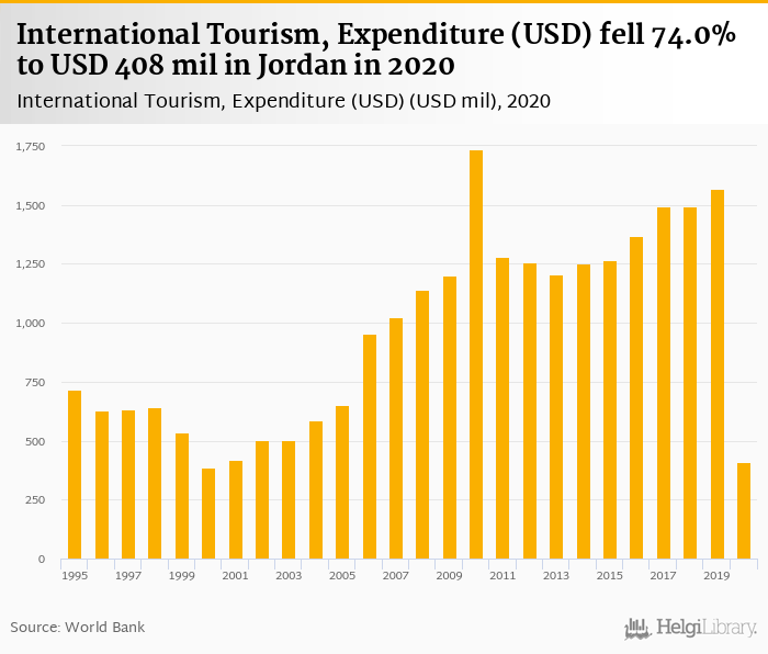Expenditure of international tourism fell 74.0% to USD 408 mil in Jordan in 2020, according to Eurostat.