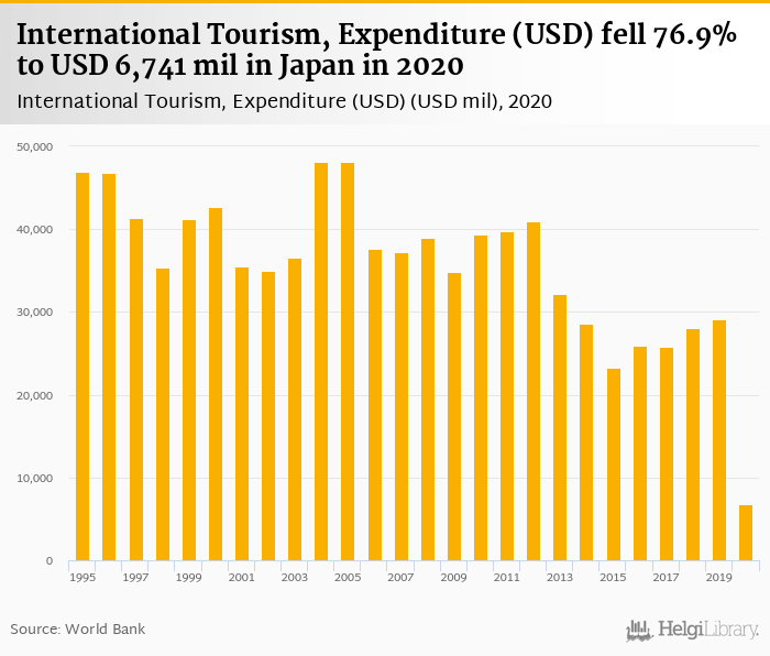 Expenditure of international tourism fell 76.9% to USD 6,741 mil in Japan in 2020, according to Eurostat.