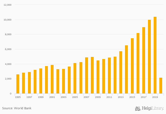 Historically, expenditure of international tourism in Israel reached an all time high of USD 10,389 mil in 2019 and an all time low of USD 2,175 mil in 2020.