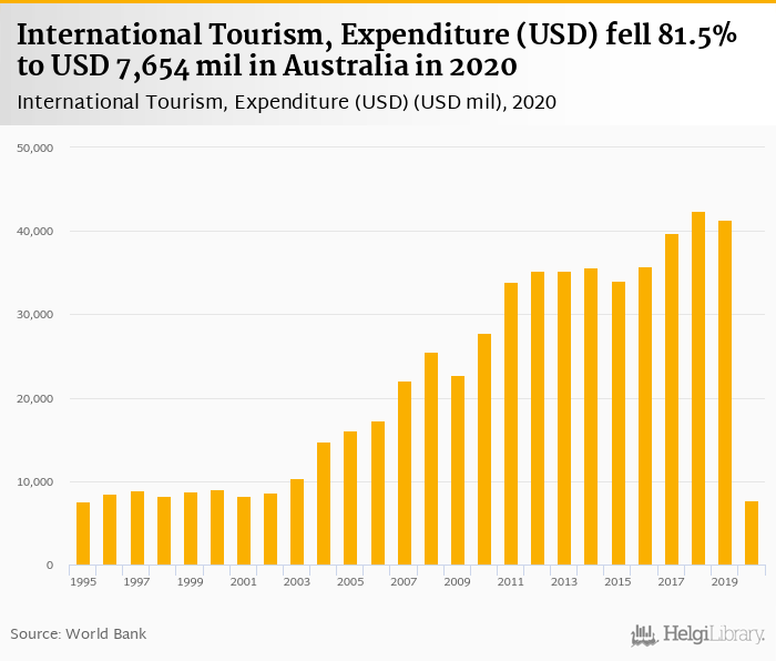 Expenditure of international tourism fell 81.5% to USD 7,654 mil in Australia in 2020, according to Eurostat.