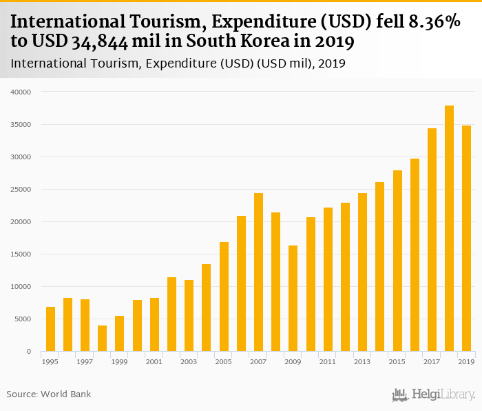 Expenditure of international tourism fell 8.36% to USD 34,844 mil in South Korea in 2019, according to Eurostat.