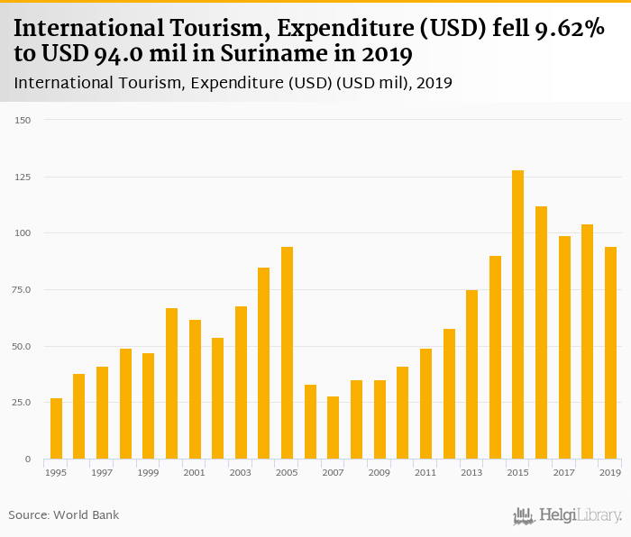 Historically, expenditure of international tourism in Suriname reached an all time high of USD 128 mil in 2015 and an all time low of USD 27.0 mil in 1995.