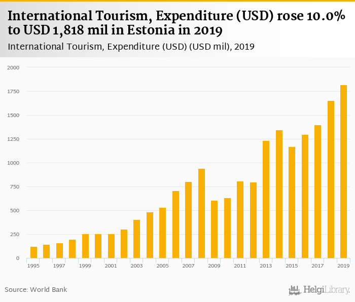 Historically, expenditure of international tourism in Estonia reached an all time high of USD 1,818 mil in 2019 and an all time low of USD 121 mil in 1995.