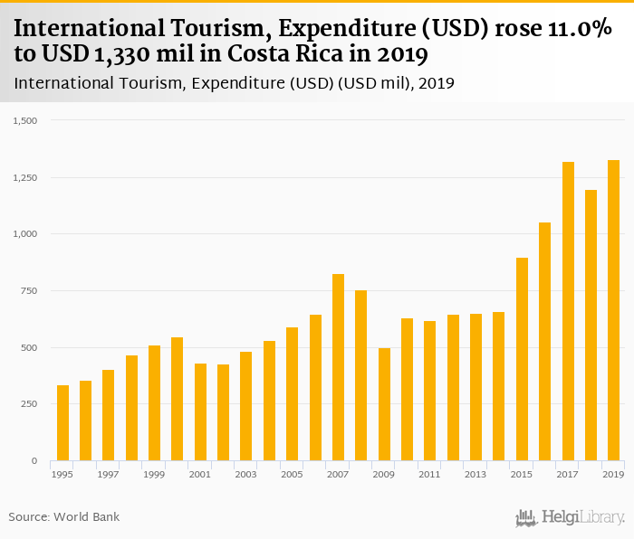 Expenditure of international tourism rose 11.0% to USD 1,330 mil in Costa Rica in 2019, according to Eurostat.