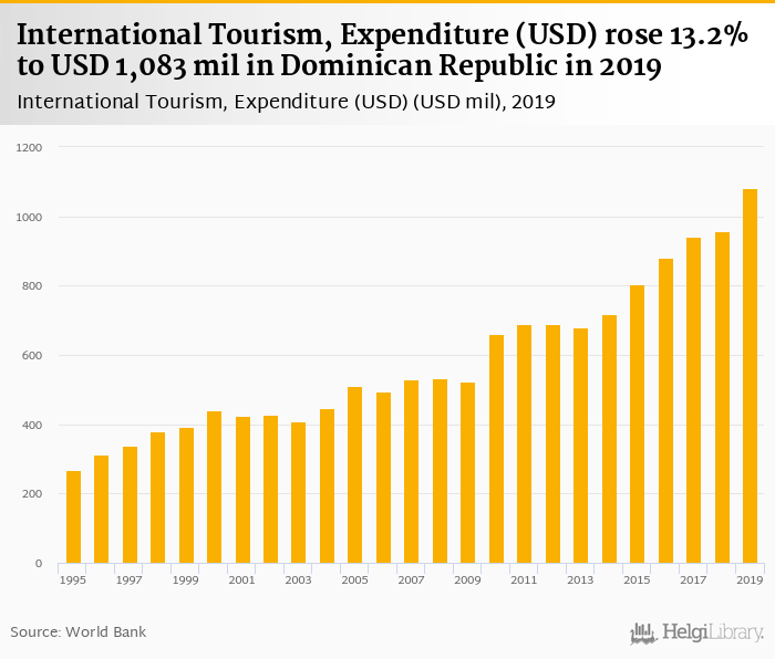 Expenditure of international tourism rose 13.2% to USD 1,083 mil in Dominican Republic in 2019, according to Eurostat.
