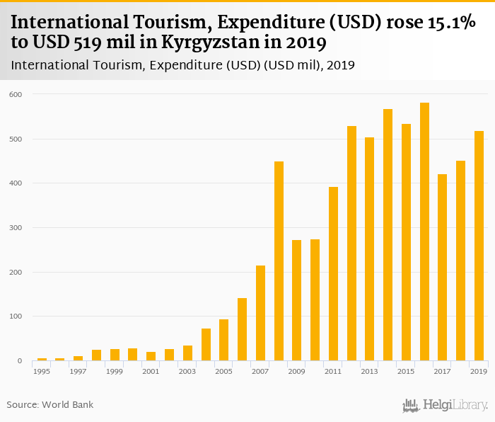 Expenditure of international tourism rose 15.1% to USD 519 mil in Kyrgyzstan in 2019, according to Eurostat.