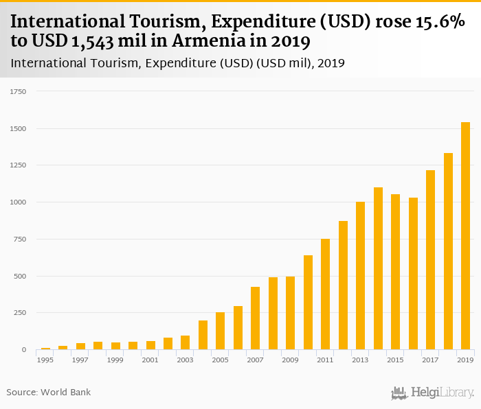 Expenditure of international tourism rose 15.6% to USD 1,543 mil in Armenia in 2019, according to Eurostat.