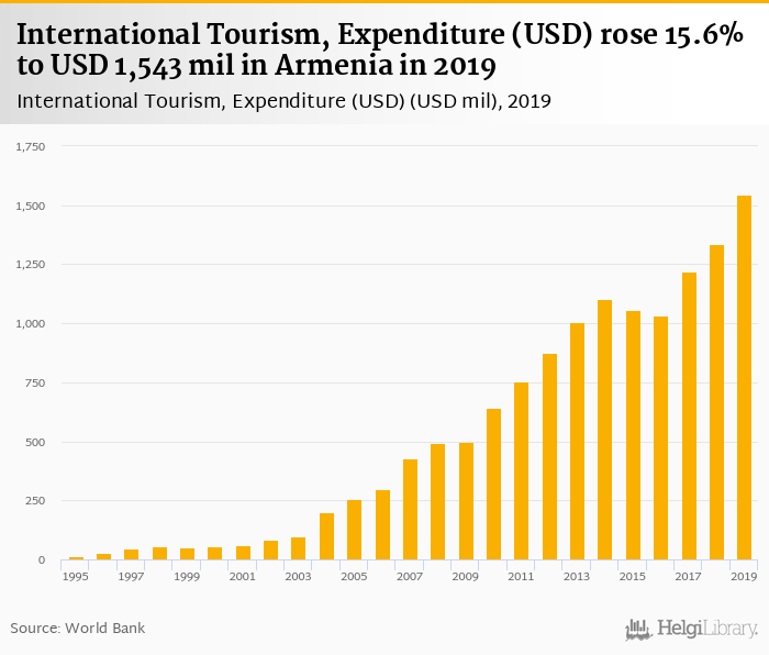 Expenditure of international tourism rose 15.6% to USD 1,543 mil in Armenia in 2019, according to Eurostat.