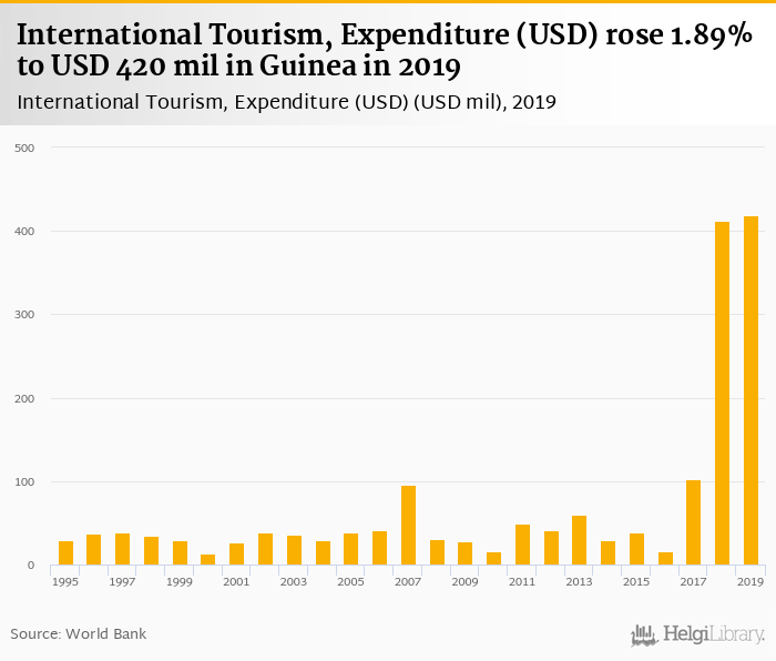 International Tourism, Expenditure (USD) rose 1.89% to USD 420 mil in Guinea in 2019