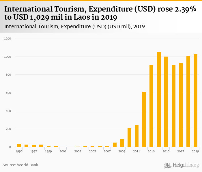 Expenditure of international tourism rose 2.39% to USD 1,029 mil in Laos in 2019, according to Eurostat.