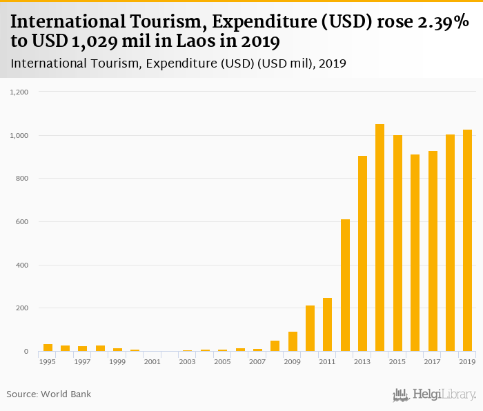 Expenditure of international tourism rose 2.39% to USD 1,029 mil in Laos in 2019, according to Eurostat.
