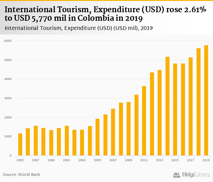 Expenditure of international tourism rose 2.61% to USD 5,770 mil in Colombia in 2019, according to Eurostat.