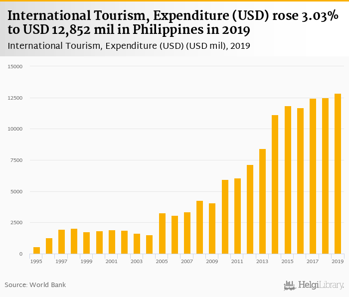 Expenditure of international tourism rose 3.03% to USD 12,852 mil in Philippines in 2019, according to Eurostat.