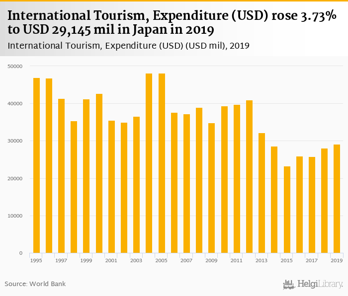 Expenditure of international tourism rose 3.73% to USD 29,145 mil in Japan in 2019, according to Eurostat.