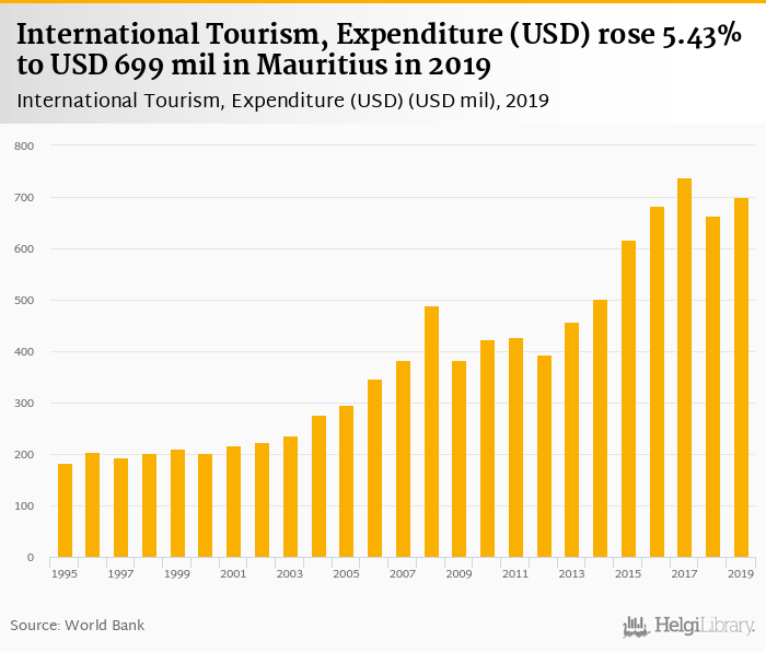 Expenditure of international tourism rose 5.43% to USD 699 mil in Mauritius in 2019, according to Eurostat.