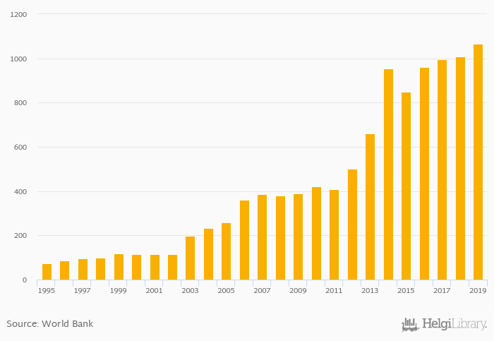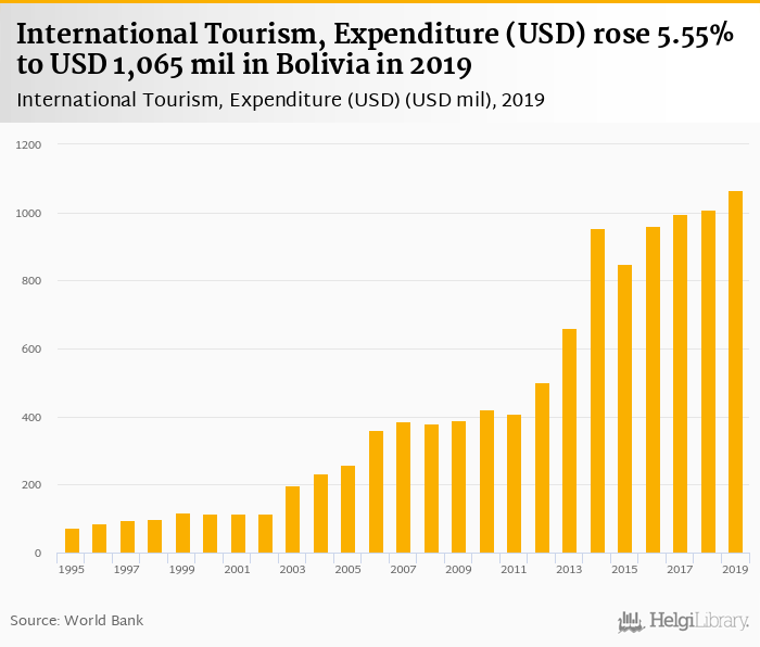 Expenditure of international tourism rose 5.55% to USD 1,065 mil in Bolivia in 2019, according to Eurostat.