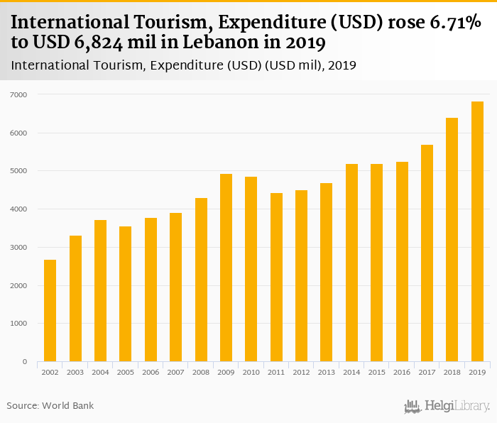 Expenditure of international tourism rose 6.71% to USD 6,824 mil in Lebanon in 2019, according to Eurostat.