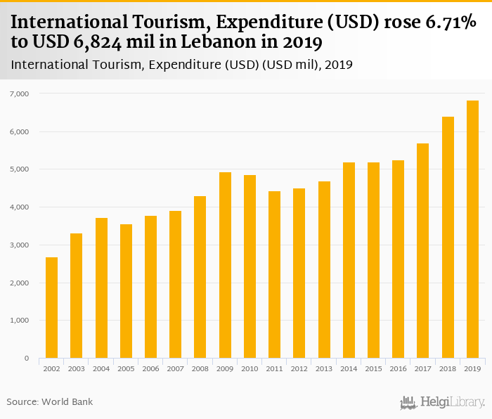 Expenditure of international tourism rose 6.71% to USD 6,824 mil in Lebanon in 2019, according to Eurostat.
