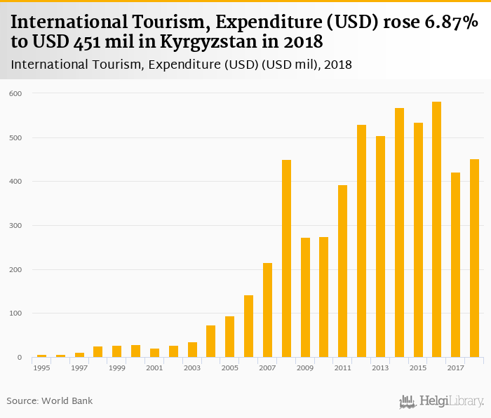 Historically, expenditure of international tourism in Kyrgyzstan reached an all time high of USD 582 mil in 2016 and an all time low of USD 7.00 mil in 1995. When compared to Kyrgyzstan's main peers, expenditure of international tourism in China amounted to USD 277,345 mil, USD 2,852 mil in Kazakhstan, USD 24.2 mil in Tajikistan and USD 2,722 mil in Uzbekistan in 2018.
