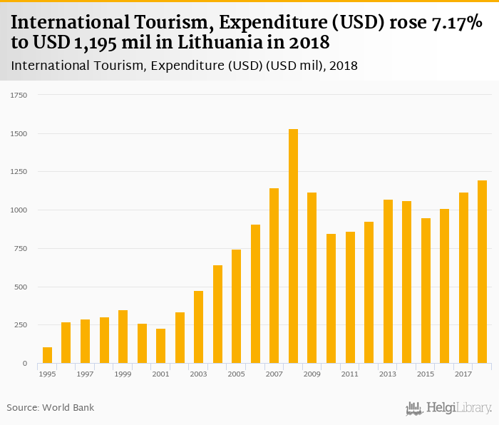 Expenditure of international tourism rose 7.17% to USD 1,195 mil in Lithuania in 2018, according to Eurostat.