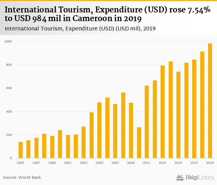 Expenditure of international tourism rose 7.54% to USD 984 mil in Cameroon in 2019, according to Eurostat.